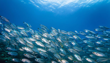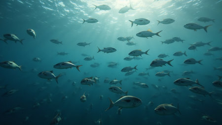 Vibrant aquatic scene featuring a swarm of fish, capturing the dynamic movement and marine life.