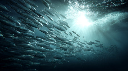 A mesmerizing school of silver fish moves in perfect unison through the deep blue ocean. Ethereal sunbeams pierce the darkness from above, illuminating their path and creating a scene of serene beauty and natural harmony. This image captures the mystery and majesty of the underwater world.