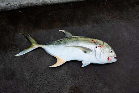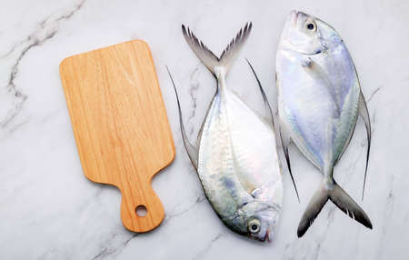 Fresh Longfin trevally fish set up on white marble kitchen table background. Top view and copy space.