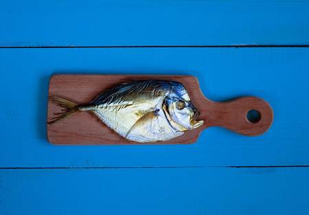 smoked fish on a light wooden board on a blue background, top view, space for text, macro