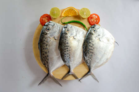 Fresh Malabar Trevally fish decorated with herbs and fruits on a wooden pad ,Isolated on white Background.Selective focus.
