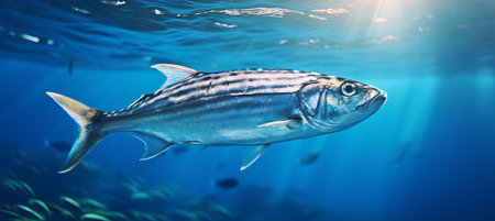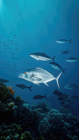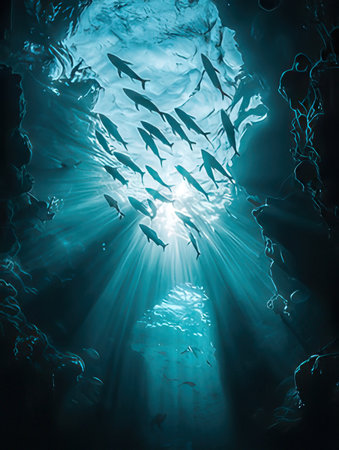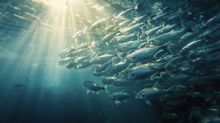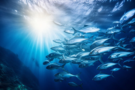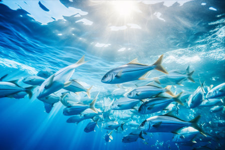 A mesmerizing underwater scene featuring a school of fish swimming gracefully in the ocean depths. Rays of sunlight penetrate the water's surface, creating a tranquil atmosphere. This captivating image showcases the beauty of marine life and the serene underwater environment.
