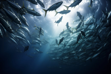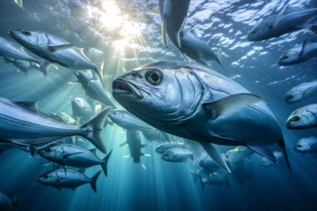 A large school of tuna swims beneath the surface of a vibrant blue ocean. Rays of sunlight penetrate the water, illuminating the scene as the fish glide smoothly together.