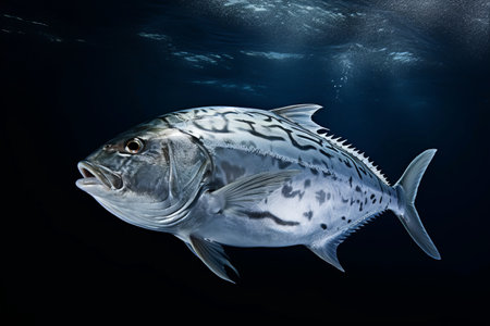 Photo realistic image of a tuna swimming close to the surface of the water. Generative AI illustration.