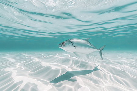 A sleek silver fish glides effortlessly through clear blue water, illuminated by sunlight filtering from above. Schools of smaller fish can be seen in the background, adding vibrancy.