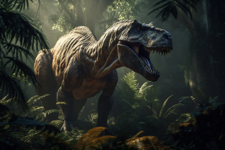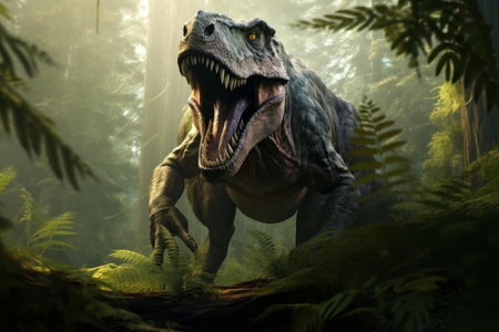 T-Rex dinosaur in the jungle, with its mouth open in a menacing growl, surrounded by lush vegetation and towering trees. The artwork is inspired by the Jurassic World concept. ai generated