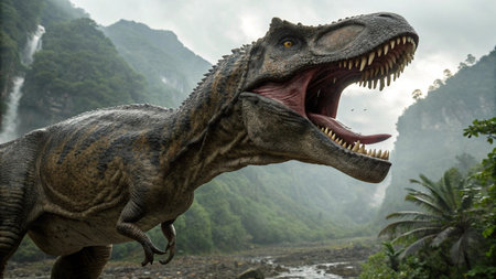 Dinosaur roars in mountain landscape, showing sharp teeth and colorful scales. Perfect for prehistoric and nature art.