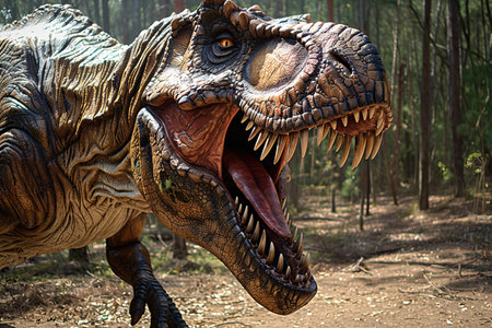 In this close-up shot, a dinosaur is depicted with its mouth wide open, showcasing its menacing teeth and jaw structure. The fierce expression and powerful stance of the dinosaur are captured in vivid detail.