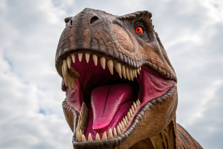 A detailed close-up of a roaring Tyrannosaurus rex shows its sharp teeth and intense eyes against a backdrop of dark, cloudy skies. The image captures the dinosaur's fierce presence.