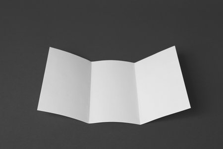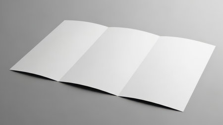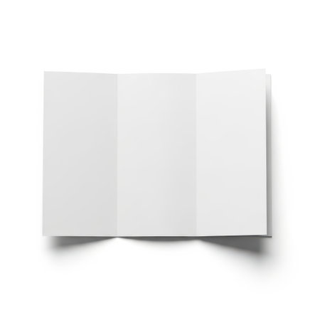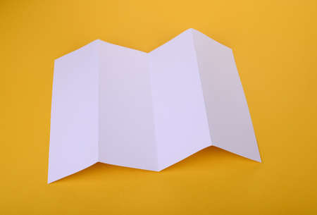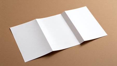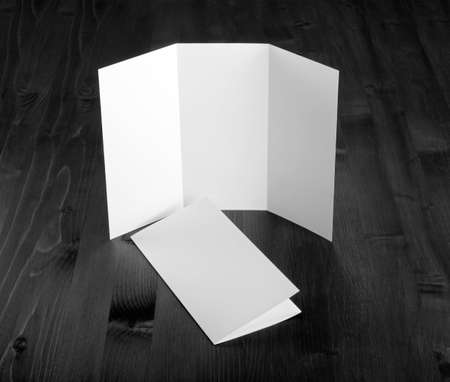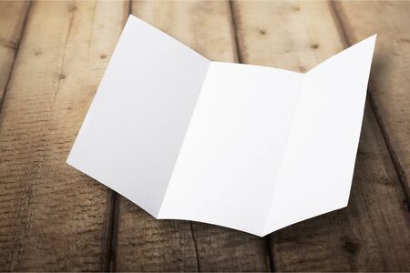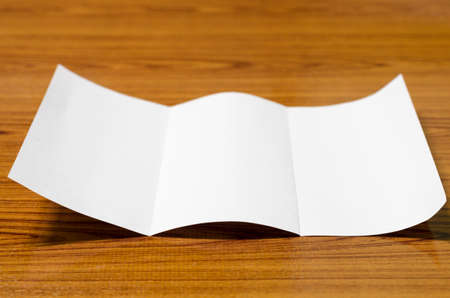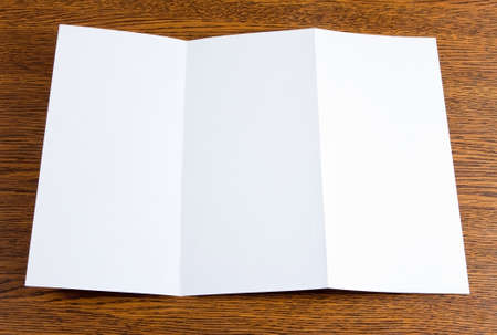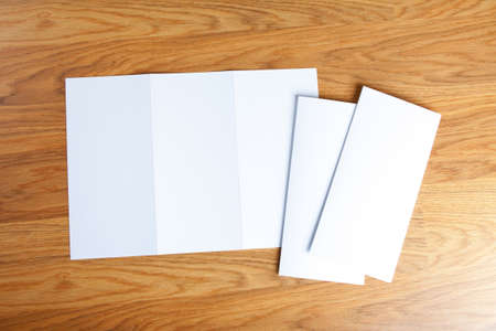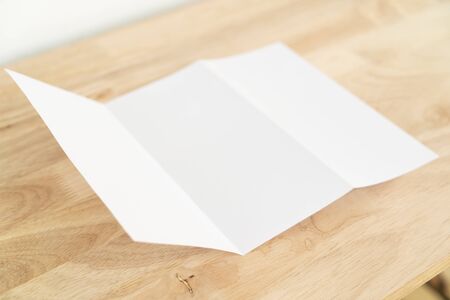 A4 tri-fold brochure blank white template for mock up and presentation design on wooden surface.