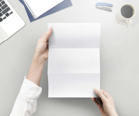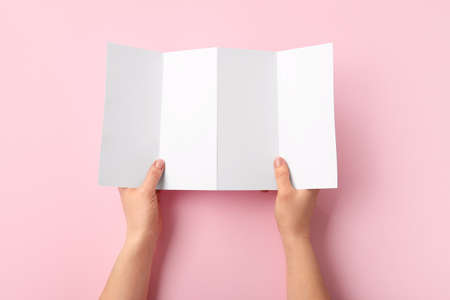 Woman hands holding blank white flyer brochure booklet. Mockup sheet template advertising booklet on blue background