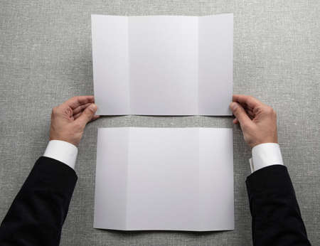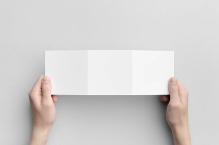 Mens hands holding empty white flyer on light gray background. Blank paper mock-up