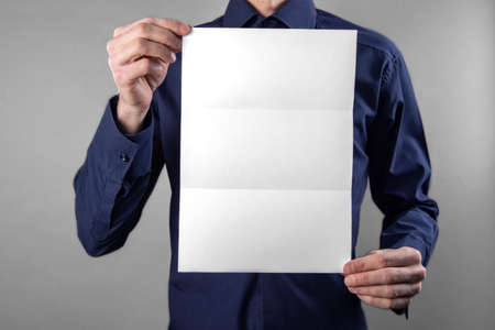A man holds a white piece of paper. A flyer in the hands of a man. Prepared for your text. Isolated on a gray background.