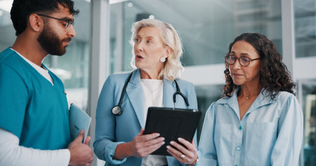 Tablet, doctor and people in hospital, conversation and medical planning with surgery feedback. Employees, man and women with discussion, tech and review for clinical trial, cooperation and results