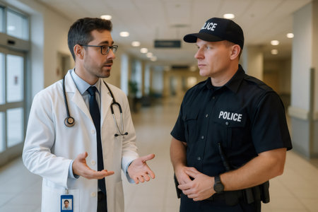 Doctor gesturing with hands while engaging in conversation with policeman in busy hospital hallway, discussing important medical and legal matters