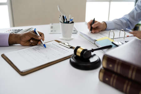 law, hammer on the table, 2 lawyers are discussing about legal provision, law matters determination, read and write.