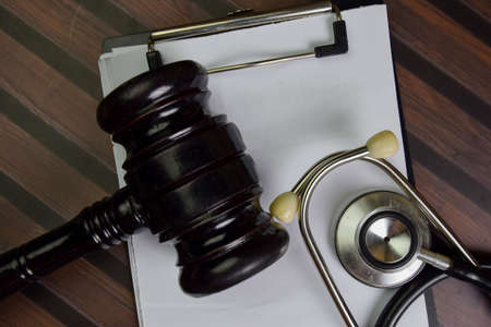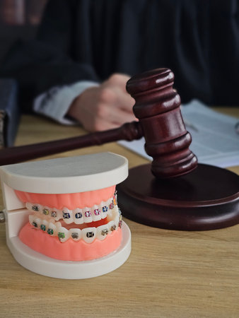 Model teeth with braces on desk near gavel and judge during legal discussion about dental rights and treatment plans