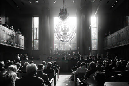 A legal team presenting a case at the International Court of Justice, focused on upholding the rights of individuals facing persecution