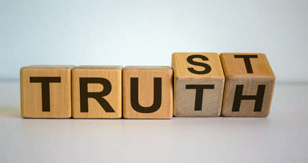 Wooden cubes and changes the word 'Truth' to 'Trust'. Beautiful white background.