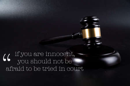 A gavel on a black background with the text if you are innocent, you should not be afraid to be tried in court.