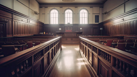 A Gavel Poised on the Tabletop Against a Blurred Courtroom Backdrop. Generative AI