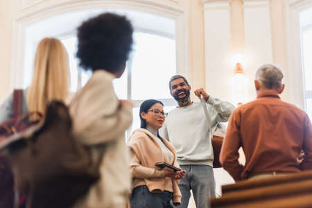 Cheerful african american student holding backpack near asian friend and teacher at university