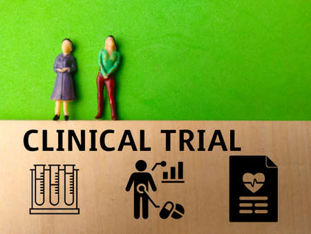 Miniature people and icon with text CLINICAL TRIAL on green background.