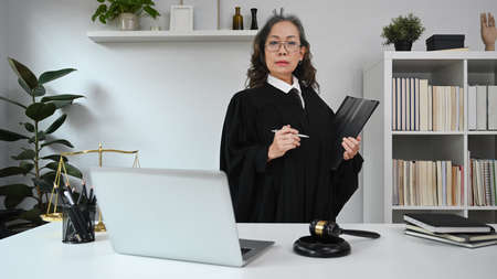 Senior female in robe gown uniform holding document and looking confidently to camera. Lawyer, justice and law, attorney, concept.