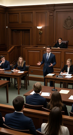 A lawyer in a suit stands and gestures while addressing a courtroom, with a judge on the bench, a jury in the box, and other participants seated at tables, all within a traditional wooden-paneled set.