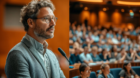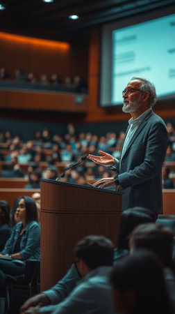 A distinguished speaker addresses an attentive audience in a formal conference setting, emphasizing communication and leadership. The setting is elegant and conveys a sense of importance.