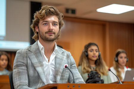 Young serious male attorney in eyeglasses and formalwear listening to prosecution side while sitting by desk with microphone during trial session