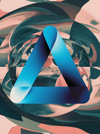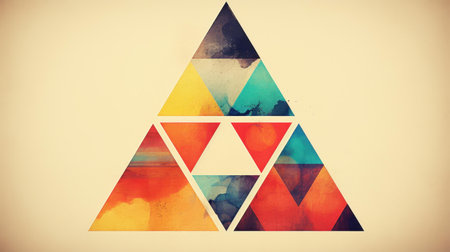 Illustration of a large, colorful triangle surrounded by abstract, angular shapes. The bold contrast of colors, such as deep purple, bright orange, and yellow, creates an eye catching design full of energy.