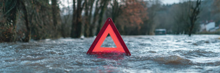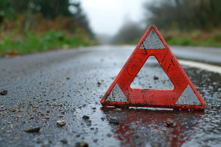 Red Warning Triangle on Wet Asphalt Road, Signaling Car Breakdown or Accident, Safety First Concept.