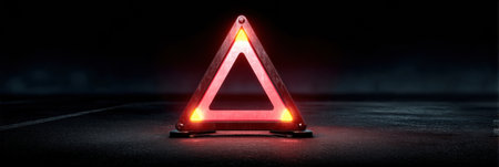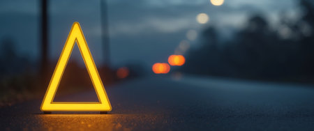 AI Generated. Luminous warning triangle on asphalt road at twilight conveying message of caution and roadside assistance with blurred background and focus on safety