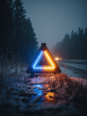 Glowing warning triangle on a foggy road