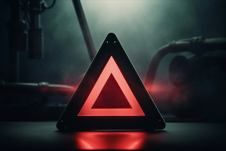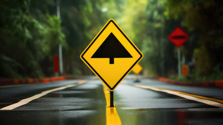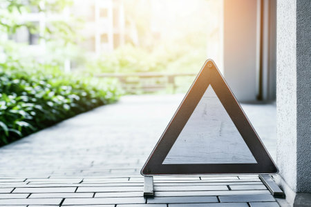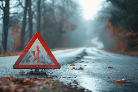 The iconic emergency sign is captured in sharp focus against a hazy, indistinct urban road, emphasizing the importance of caution and preparedness. illustration created by Generative AI