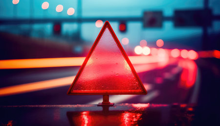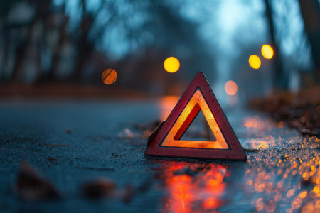 Reflective safety triangle on a rainy street during twilight with blurred lights in the background