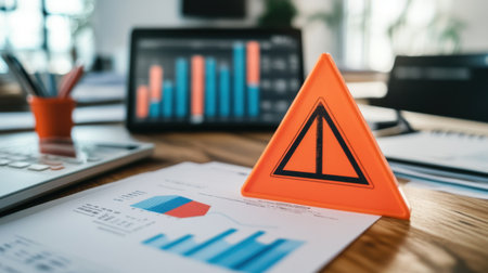 Vibrant orange warning sign in an office environment, highlighting caution amidst financial charts and data analysis, showcasing business strategy and attention to detail.