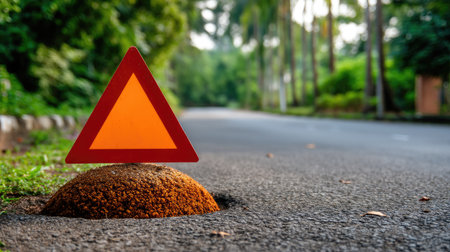 A vibrant orange triangular caution sign stands out against a quiet rural road, surrounded by lush greenery and offering a clear warning to drivers of potential hazards ahead.