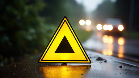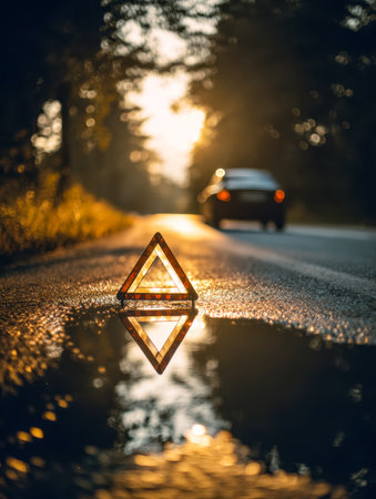 A glowing warning triangle rests on a wet roadway surface, serving as a crucial signal for caution and alertness in a low-visibility environment at sunset.
