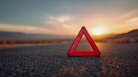 A striking red triangle rests on a tranquil roadway, kissed by sunset hues. Gentle clouds and a mirrored sky craft a calm, mesmerizing atmosphere.