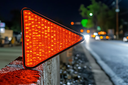 A warning triangle glows brightly as headlights shine on rainy road at night signaling caution in an urban environment where vehicles pass by.
