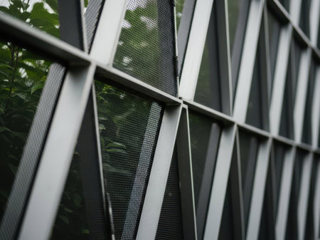 A close-up view of a contemporary building facade featuring sleek metal grids and a lush green background, showcasing modern architectural design.