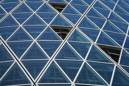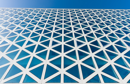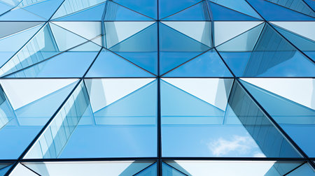 Glass window wall of modern building with blue sky reflection forming textured pattern