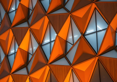 Closeup of a modern building facade featuring a geometric pattern of triangles and panels in shades of orange, brown, and blue
