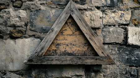 A rustic wooden frame in a triangular shape is mounted on a weathered stone wall, showcasing charming textures and natural light. Perfect for artistic projects.