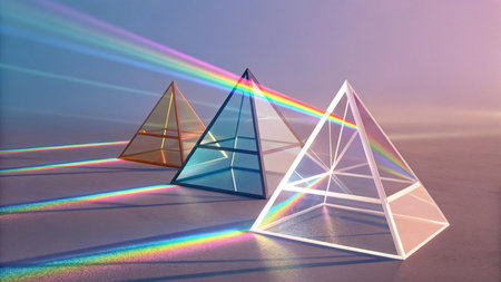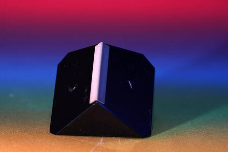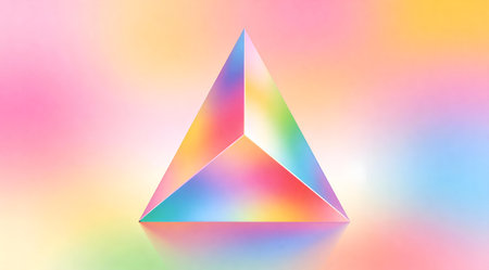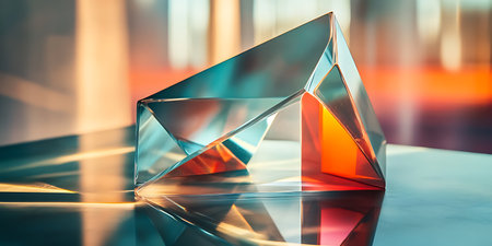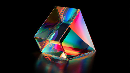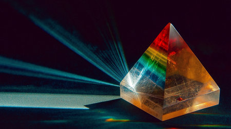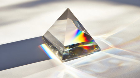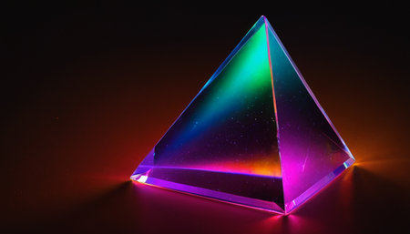 A vibrant pyramid prism displays a stunning array of colors, casting beautiful reflections on a smooth surface. Ideal for creative and artistic projects.