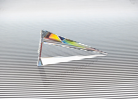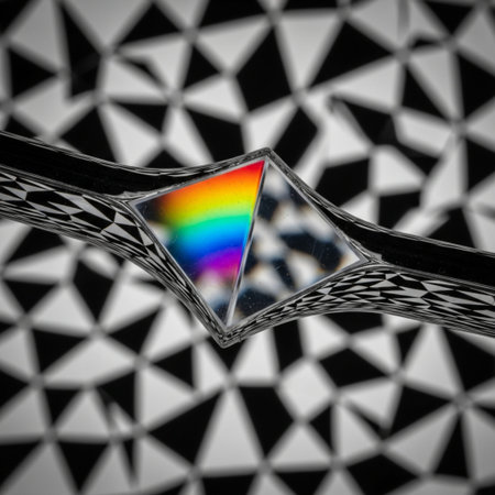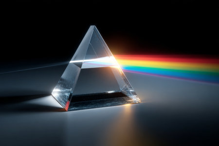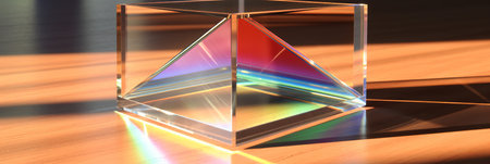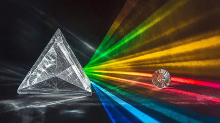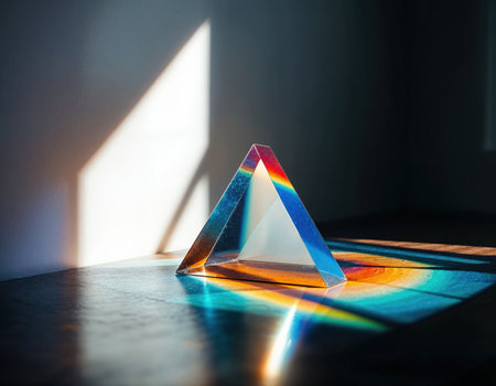 A geometric crystal triangle prism casts colorful rainbow light refractions onto a reflective surface.