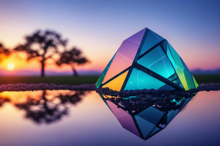 A prism casts vibrant colors onto a surface, creating a beautiful spectrum effect under the warm afternoon sunlight, highlighting its geometric shapes.