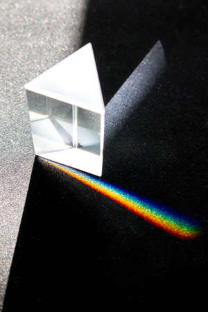 A clear prism sits on a dark surface, casting colorful light and forming a rainbow spectrum.